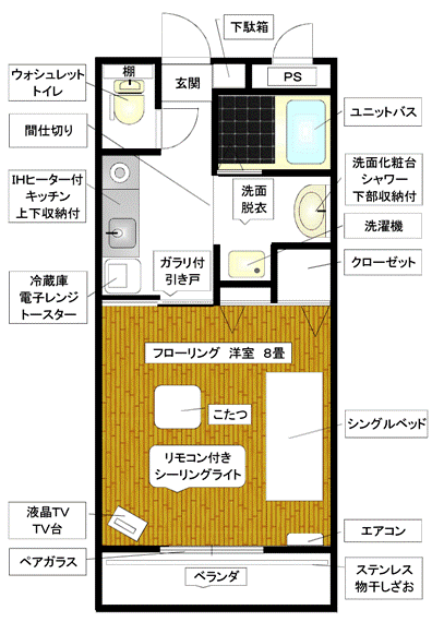 テレビ、リモコン付シーリングライト、エアコン、こたつ)